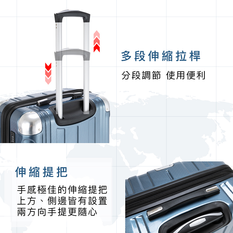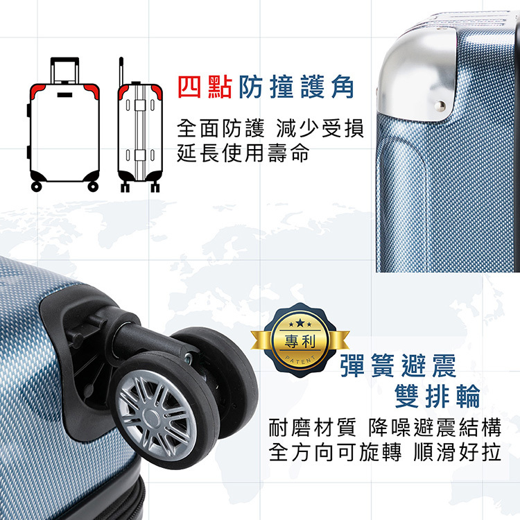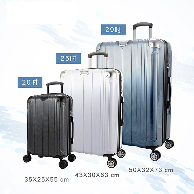 ●20吋:尺寸 L35 x W25 x H55cm、重量約 3.6kg、建議載重 : 7公斤,符合航空登機標準
