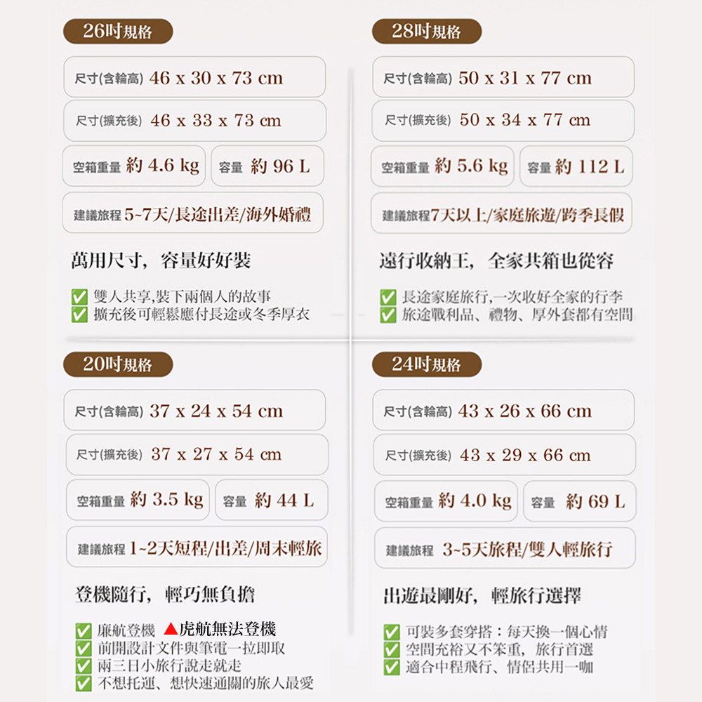 28吋:50X31X77cm(含輪)、重量約5.6kg,