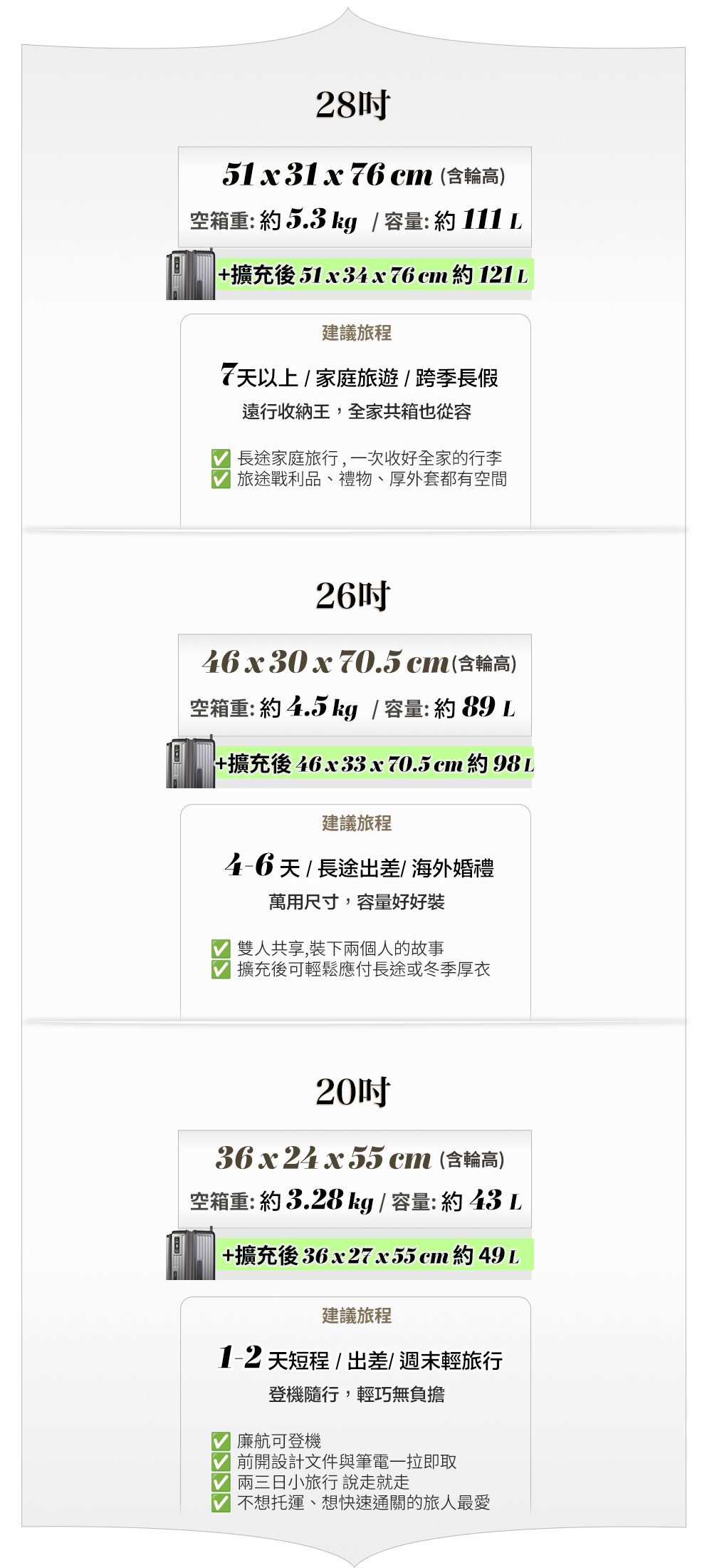 28吋:51 X 31 X 76cm(含輪)、重量約 5.3kg,