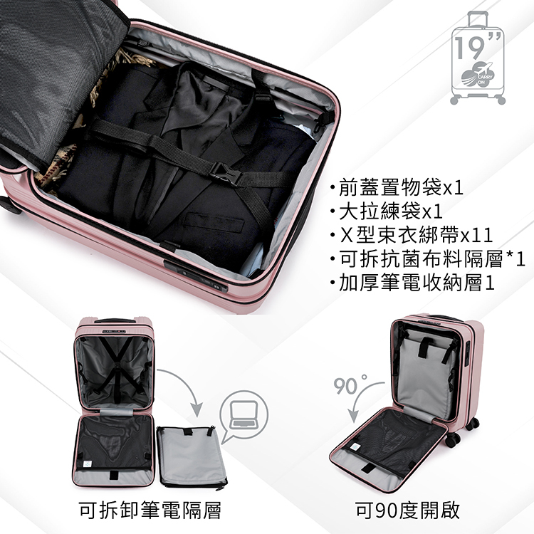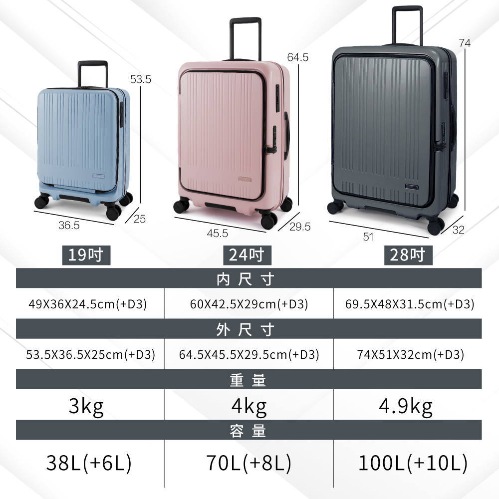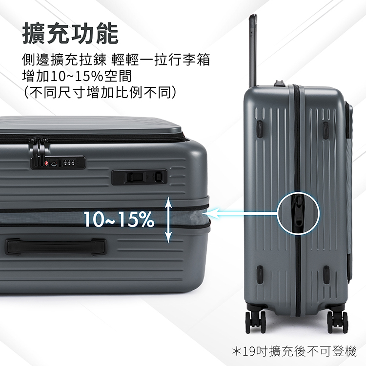 19吋:L36.5 x W25-28 x H53.5cm 總和115、重量約3kg、容量約38-44L,可擴充,未擴充狀態符合航空登機箱標準
