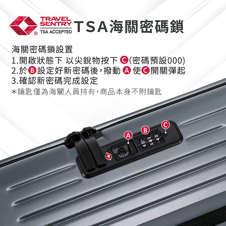 ●TSA國際海關鎖,安檢時鎖頭不會被破壞,通關更快速又安心。