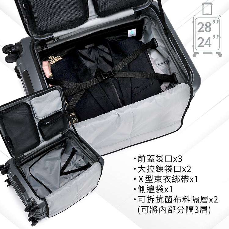 28吋:L51 x W32-35 x H74cm 總和157、重量約 4.9kg、容量約100-110L,可擴充