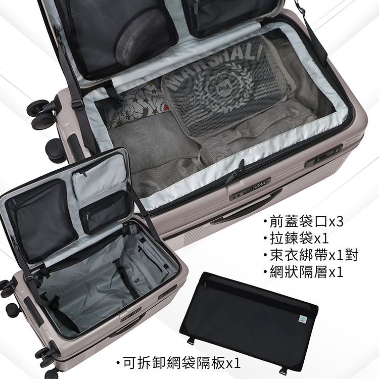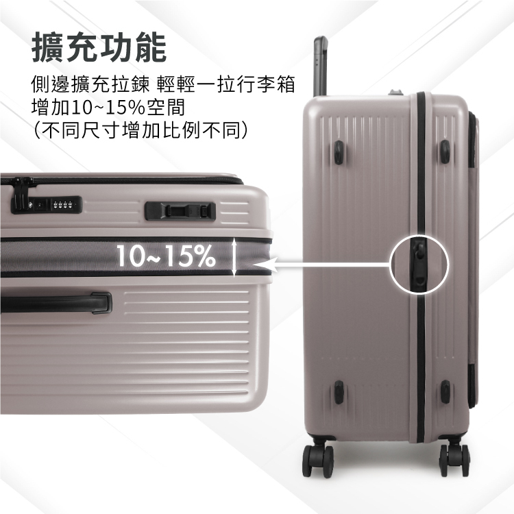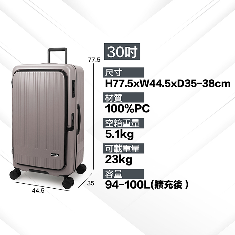 30吋:H77.5xW44.5xD35-38cm、重量約 5.1kg、容量約94-100L,可擴充