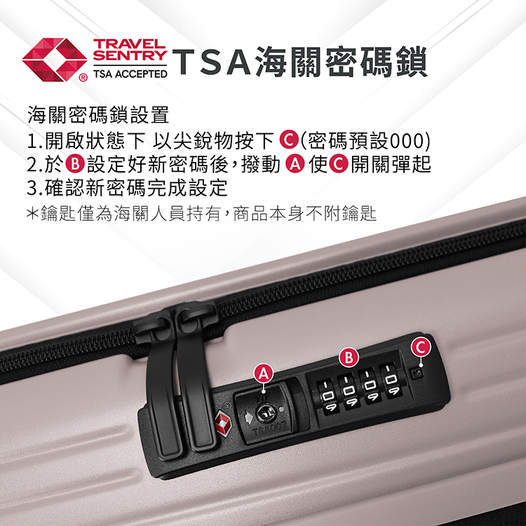 ●TSA國際海關鎖,安檢時鎖頭不會被破壞,通關更快速又安心。