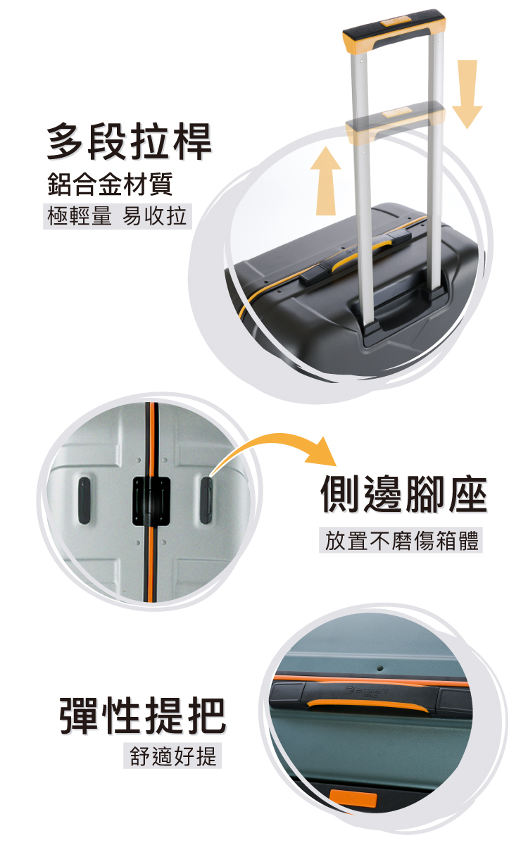 ●霧面箱體防刮耐磨,側邊腳柱可減少箱體磨擦損傷。