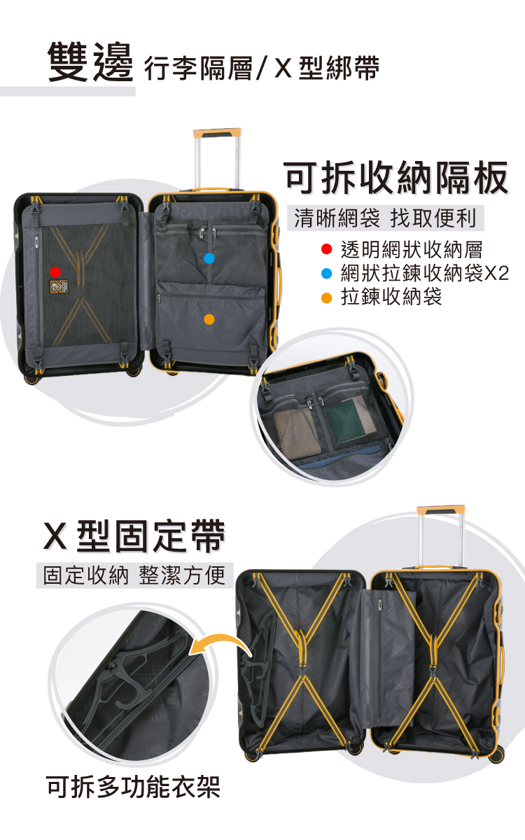 ●內部有網狀可拆式網狀拉鍊收納隔板及X型調整固定帶,內附衣架乙個,收納更清晰更靈活。