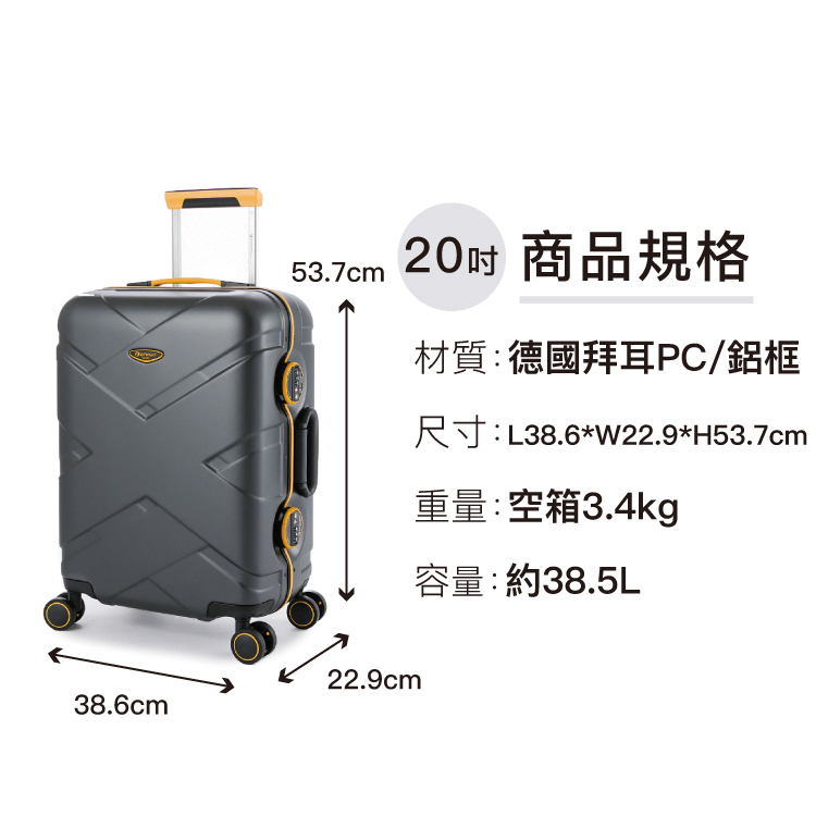 20吋:尺寸 L38.6 x W22.9 x H53.7cm、重量約 3.4kg、容量約 38.5L