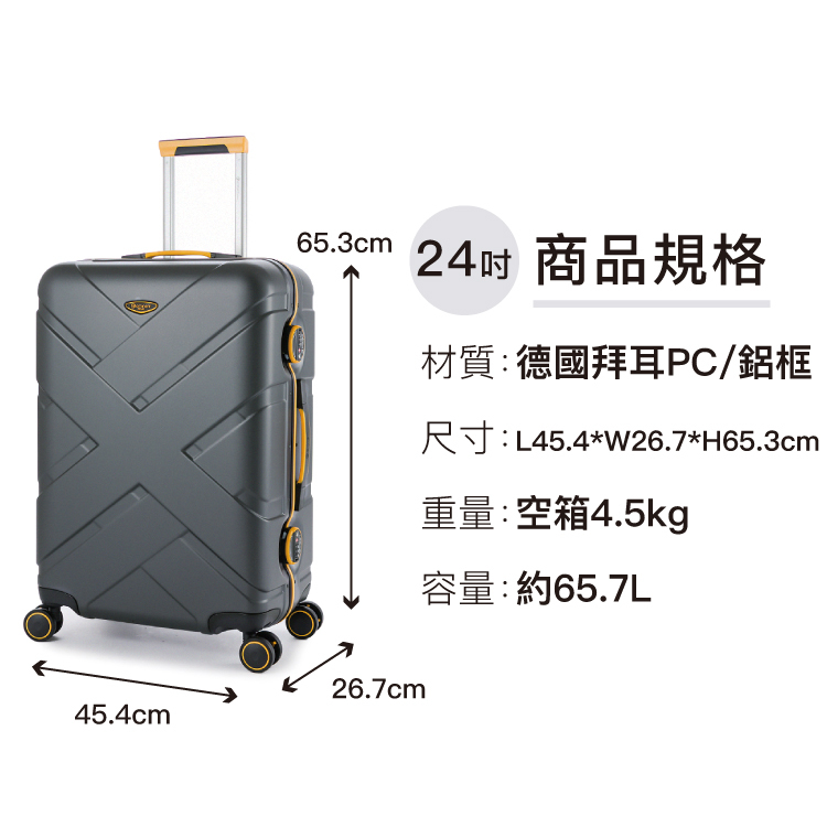 24吋:尺寸 L45.4 x W26.7 x H65.3cm、重量約 4.5kg、容量約 65.7L