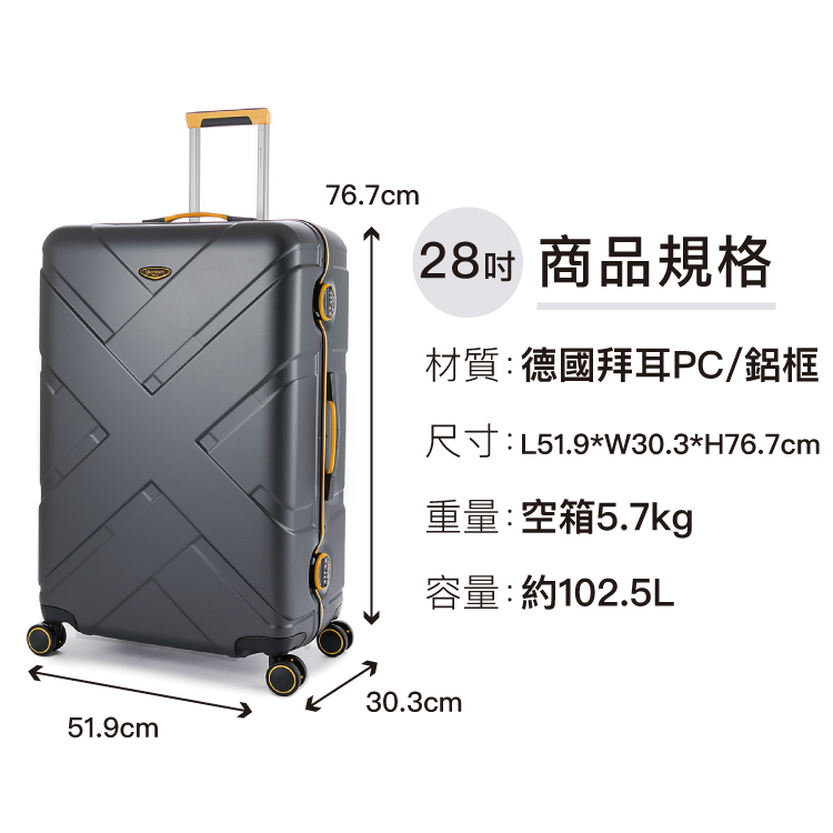 28吋:尺寸 L51.9 x W30.3 x H76.7cm、重量約 5.7kg、容量約 102.5L