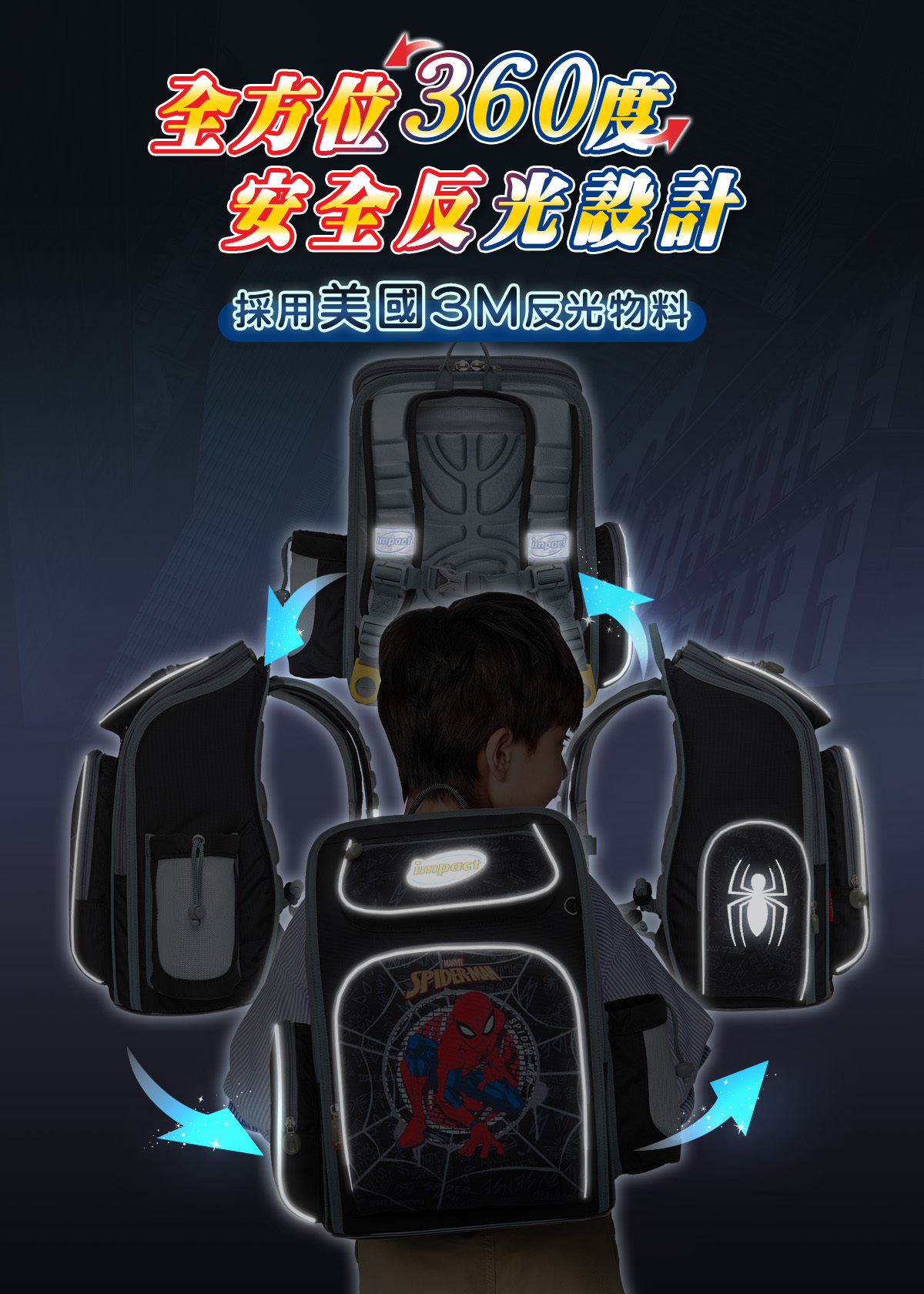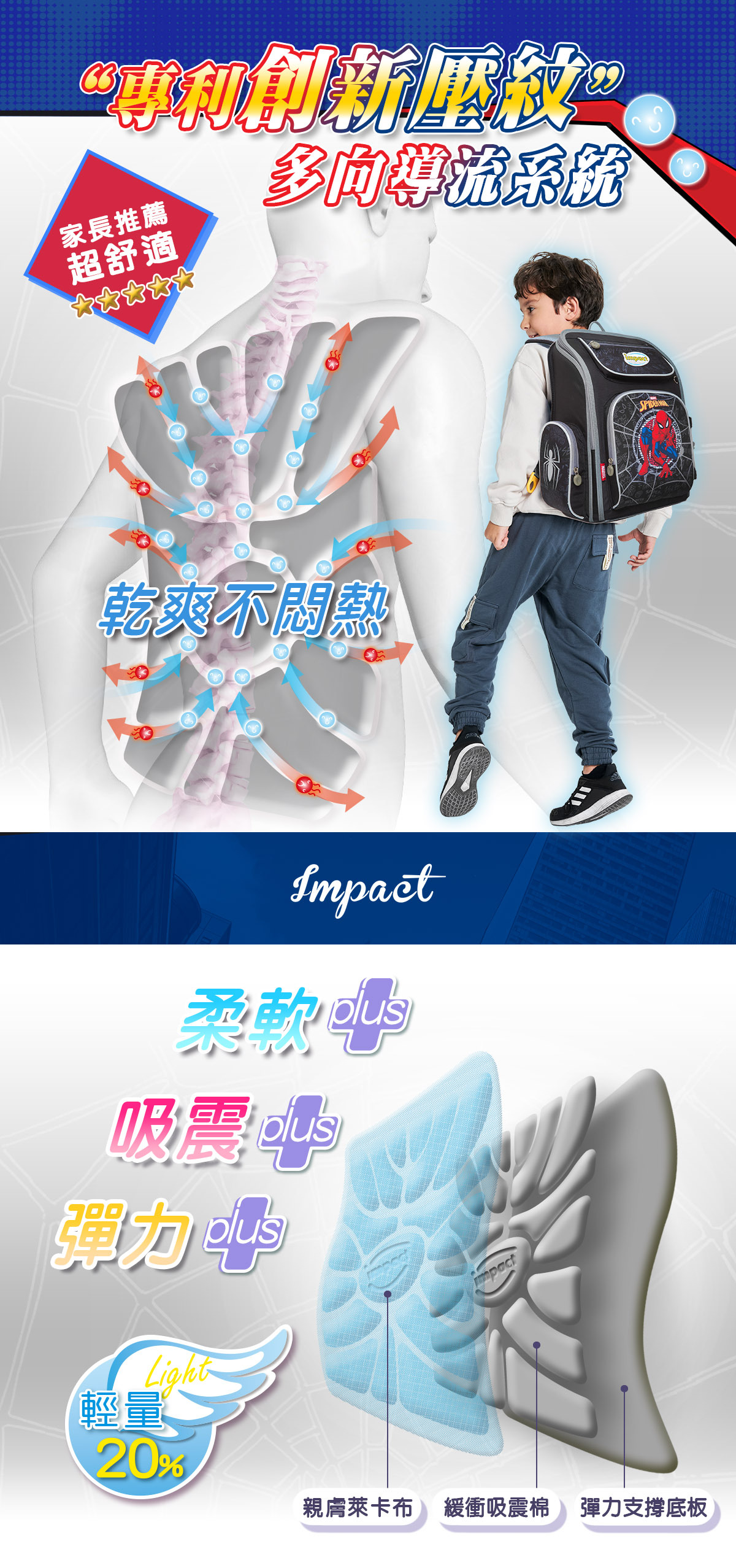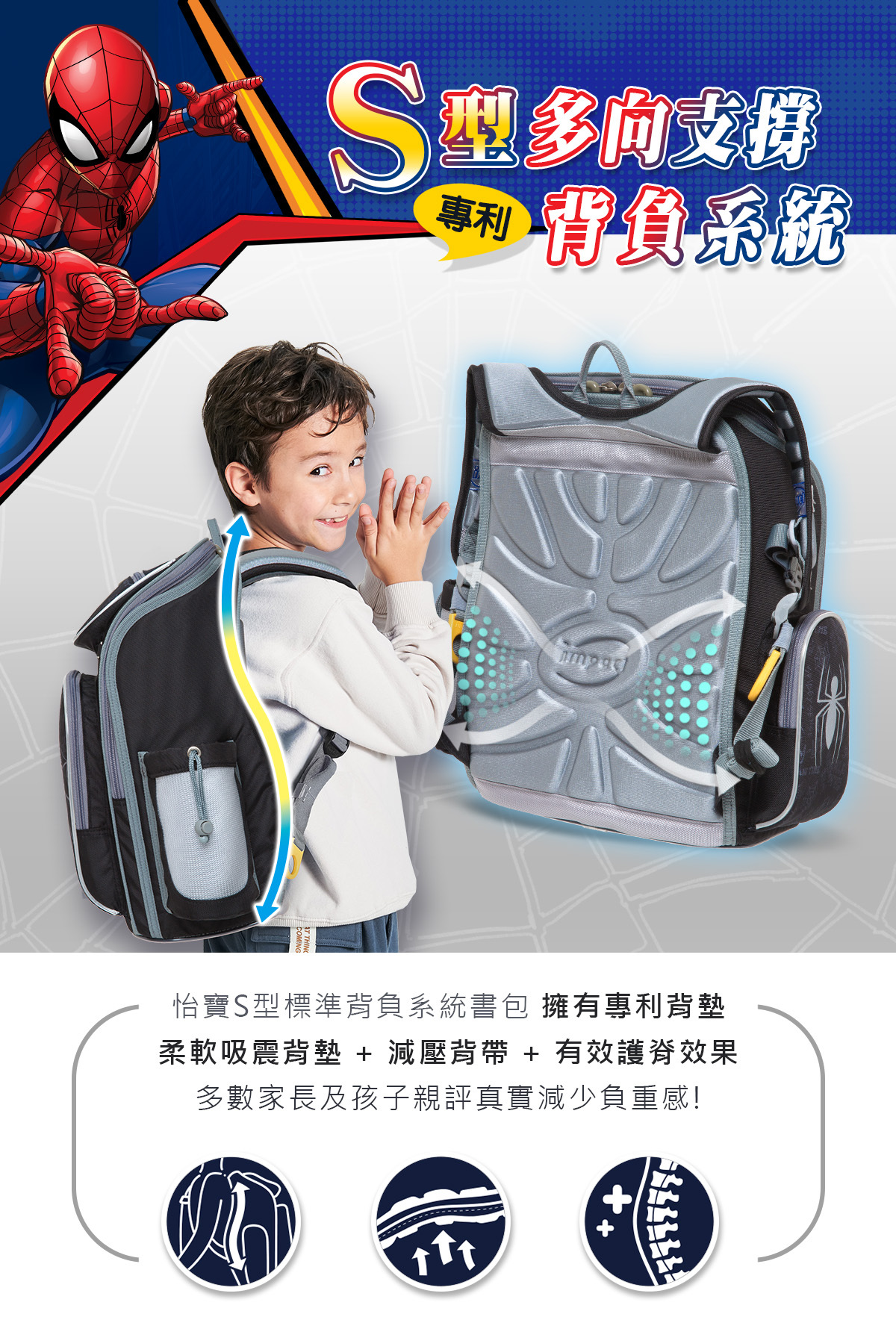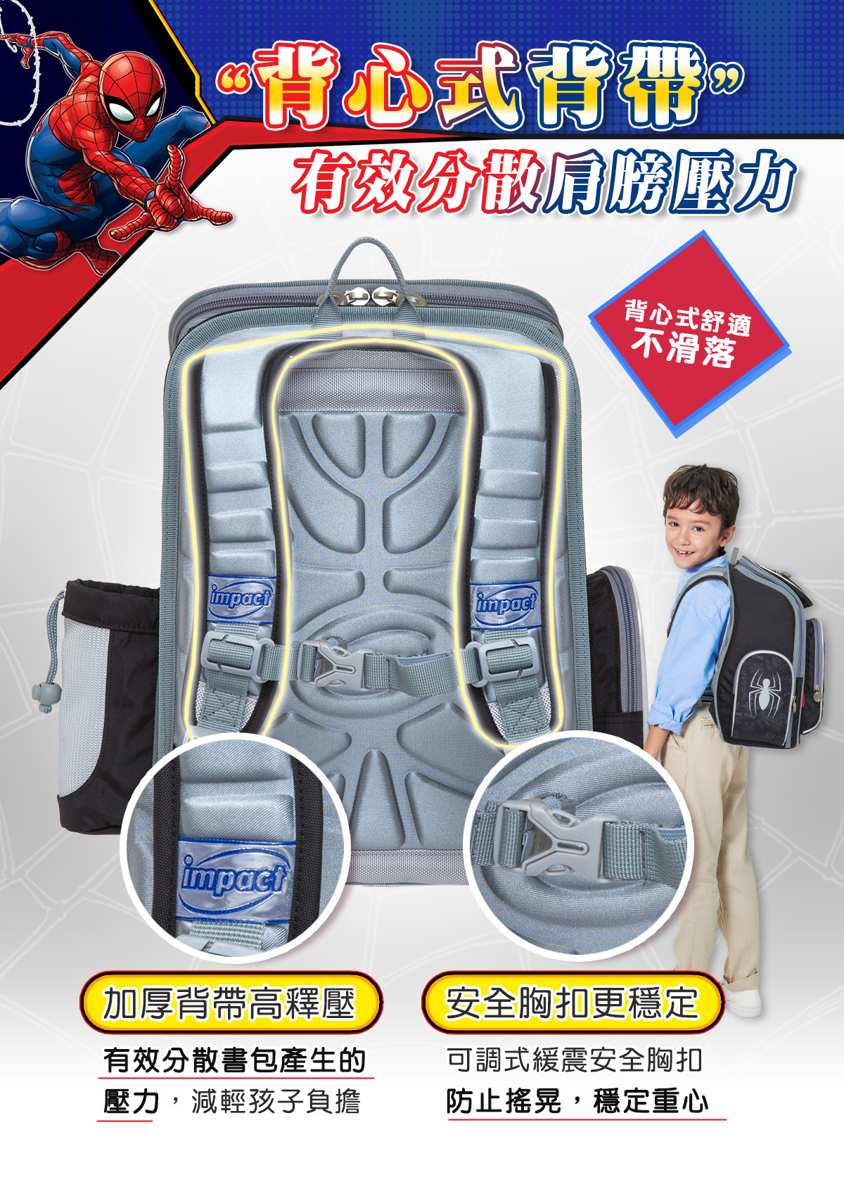 「優選小學護脊書包,關愛孩子成長」impact怡寶與 漫威蜘蛛人 聯合推出特別為國小-中低年級學童設計的護脊書包,特殊印刷展現細緻色彩效果,以漫威蜘蛛人Spider-Man為靈感,激發孩子們的勇氣和想像力。選擇怡寶蜘蛛人輕量護脊書包,讓孩子們隨著漫威蜘蛛人超級英雄的力量,開啟他們獨一無二的學習之旅!