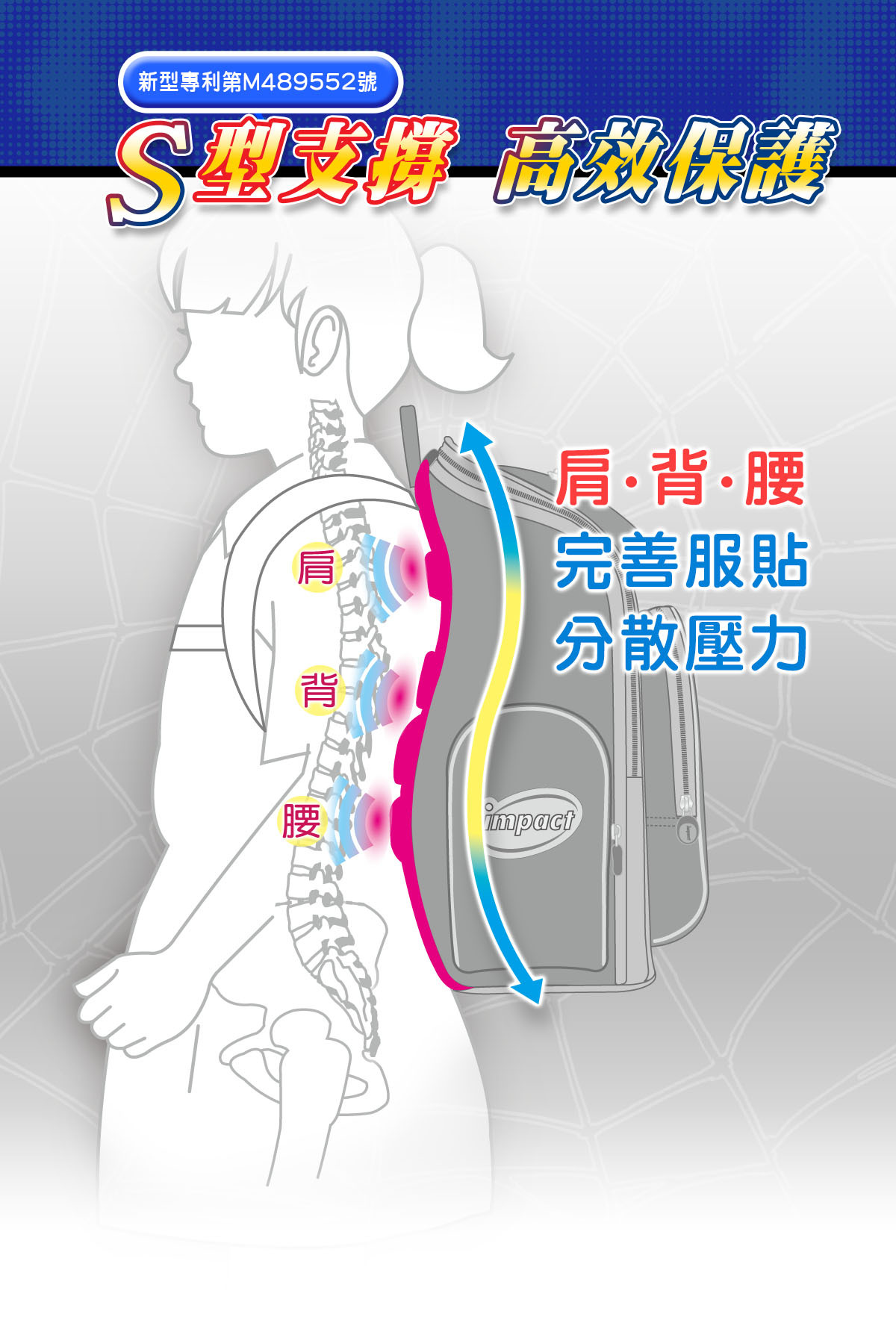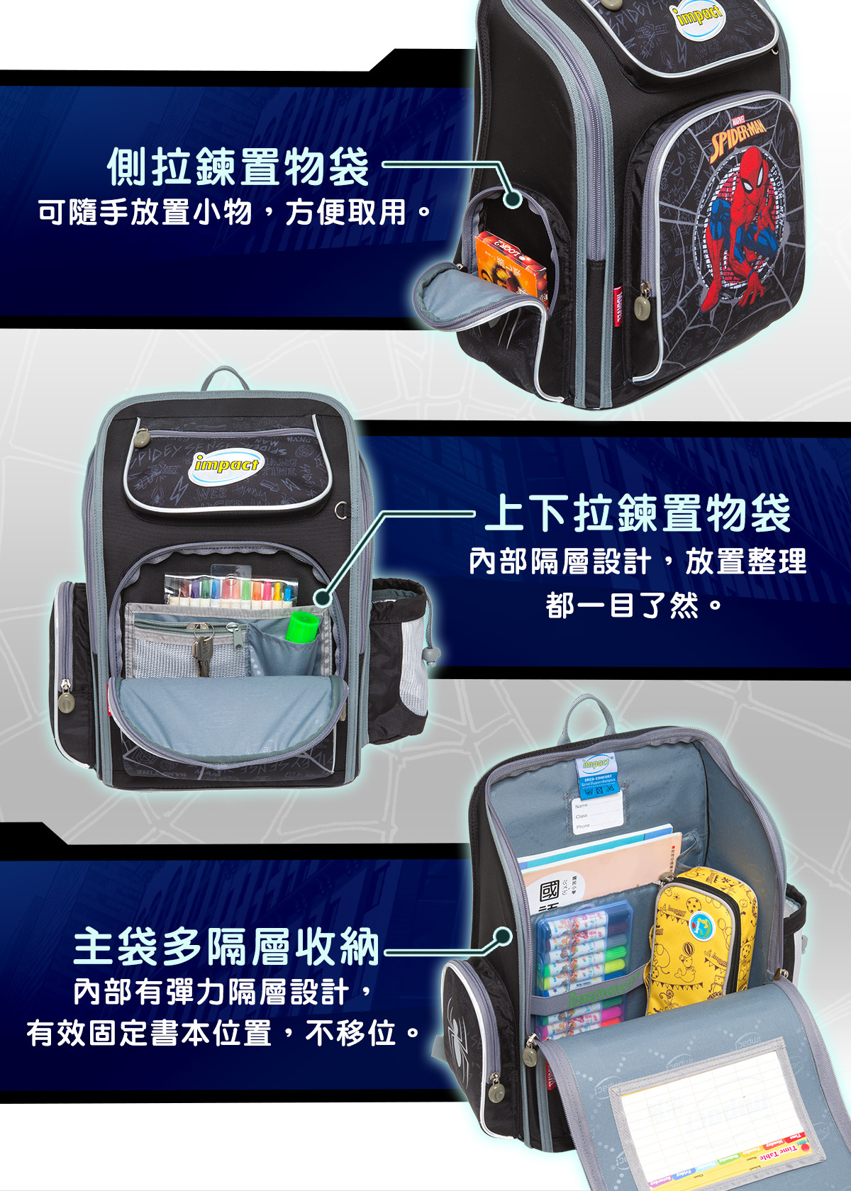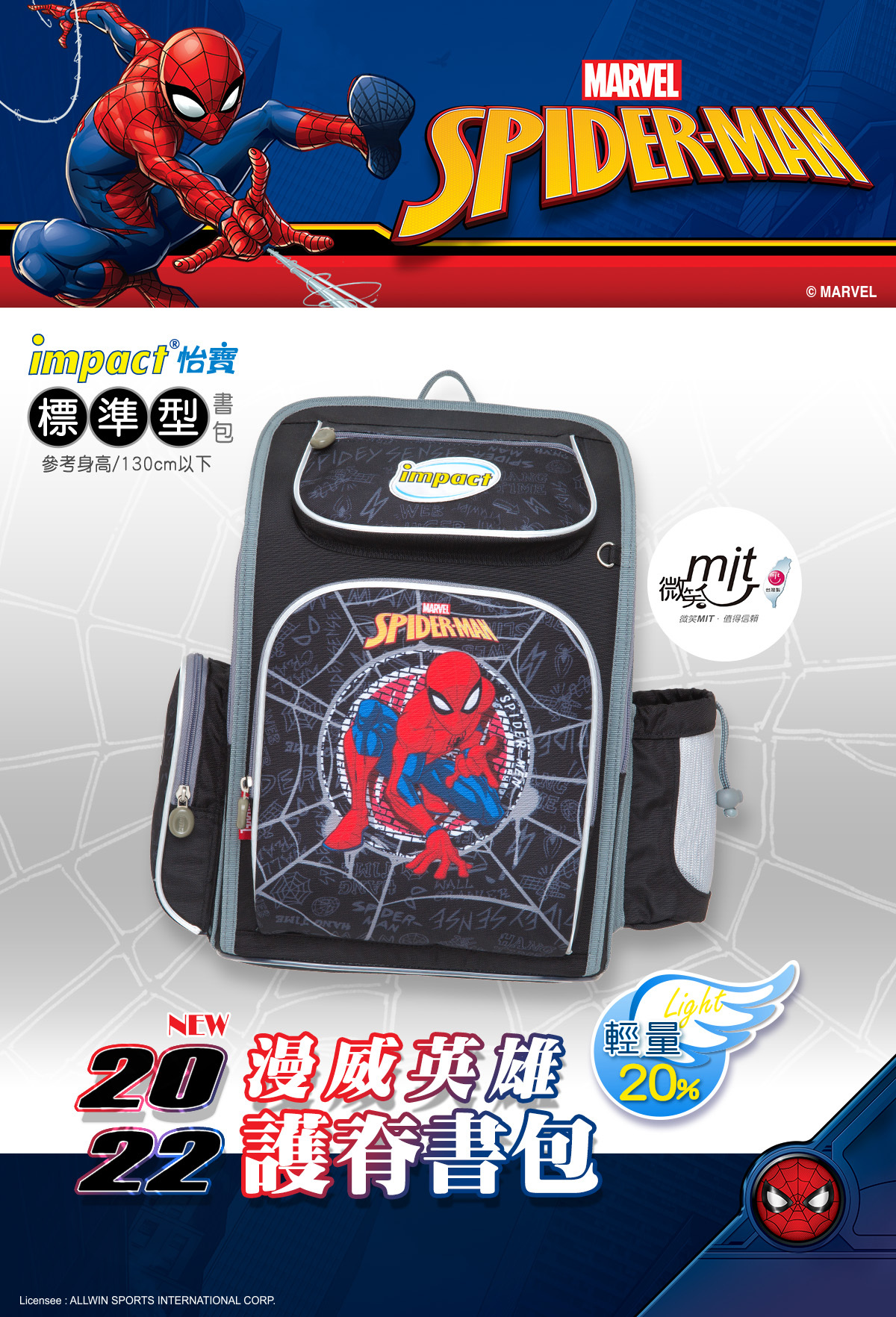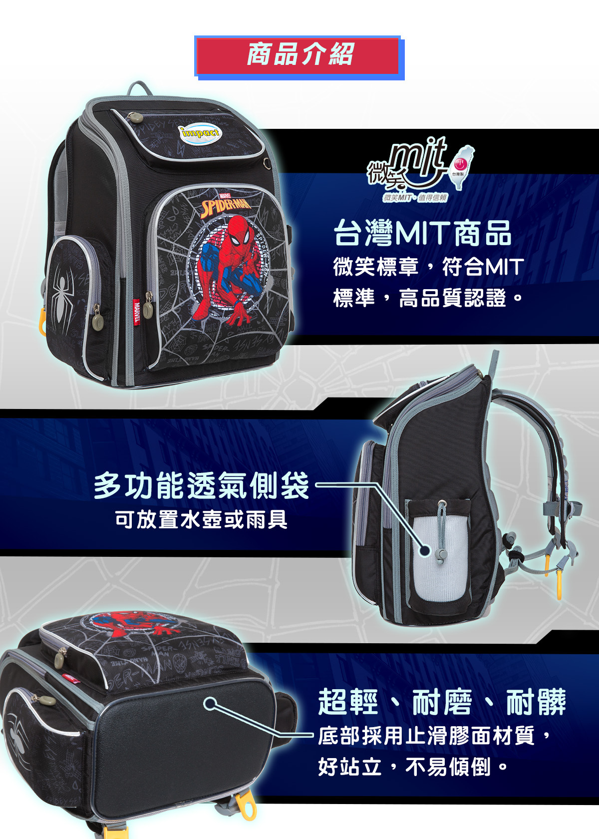 「優選小學護脊書包,關愛孩子成長」impact怡寶與 漫威蜘蛛人 聯合推出特別為國小-中低年級學童設計的護脊書包,特殊印刷展現細緻色彩效果,以漫威蜘蛛人Spider-Man為靈感,激發孩子們的勇氣和想像力。選擇怡寶蜘蛛人輕量護脊書包,讓孩子們隨著漫威蜘蛛人超級英雄的力量,開啟他們獨一無二的學習之旅!