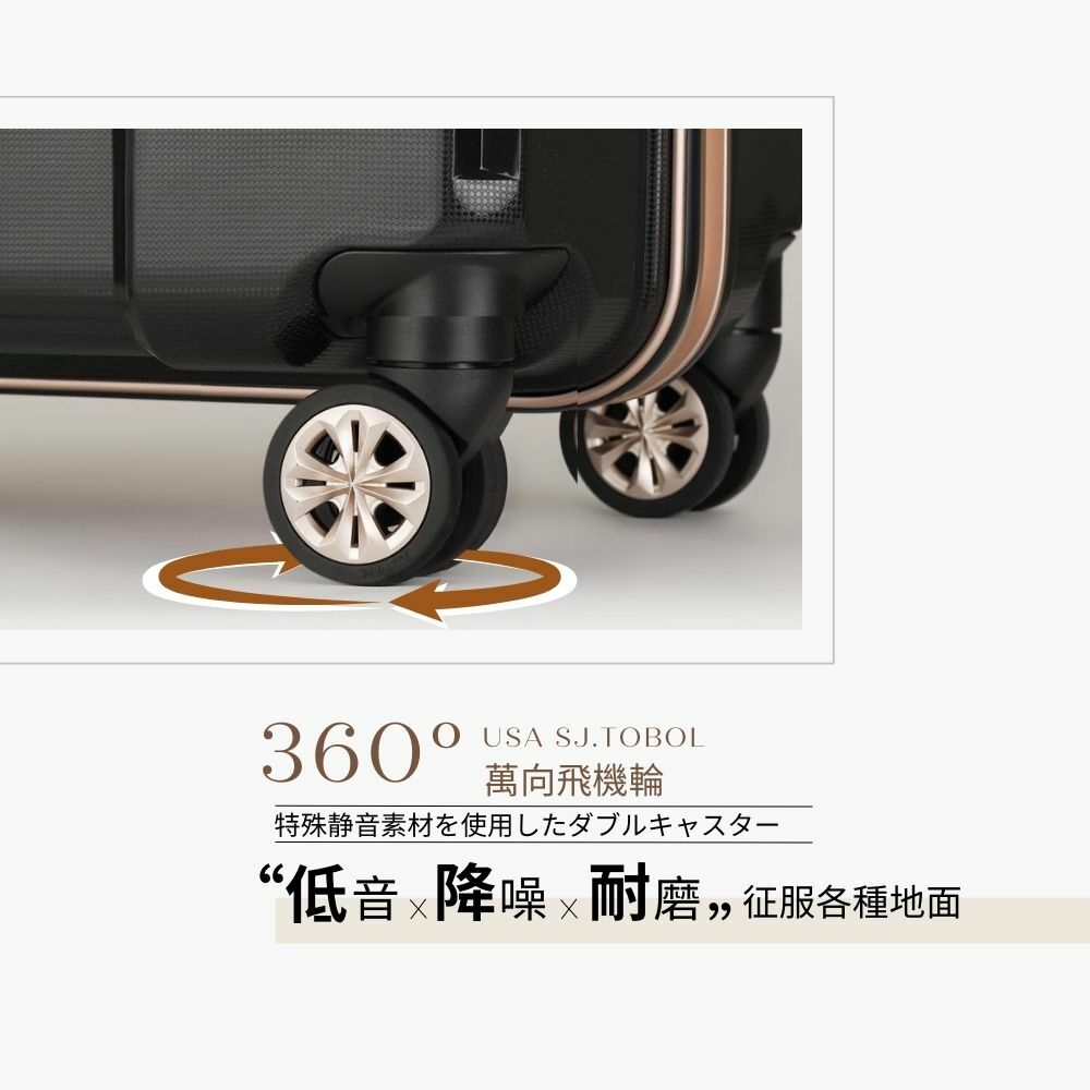 ●360度美國SJ.TOBOL萬向靜音飛機輪,耐磨降噪、滑順推拉更省力、穩定行走無負擔。