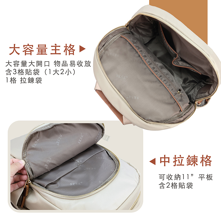• 中拉鍊格,可收納11吋平板,包含2格內貼袋。